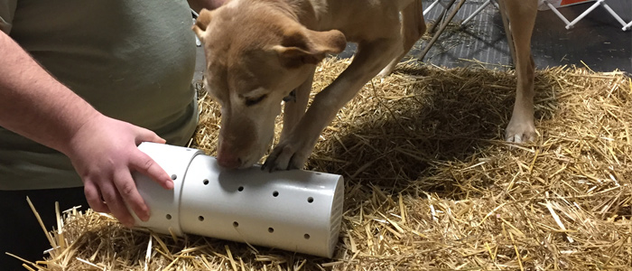 This sport was originally developed for terriers and "Earth Dogs" who were bred to eradicate vermin, as a way to demonstrate their working drive without actually harming any rodents. Pet rats are hidden in protective tubes in a maze of straw. Dog and handler must correctly locate and identify which tubes contain rats, go throuh a straw bale tunnel, and climb on at least one bale. Note: This sport involves live pet rats, who are not harmed or stressed during the game. No participant is required to touch or directly handle the rats, but because their safety and care is a top priority, those with rodent phobias may not wish to participate (you may be asked to hold a tube with a rat in it while a dog completes its course).